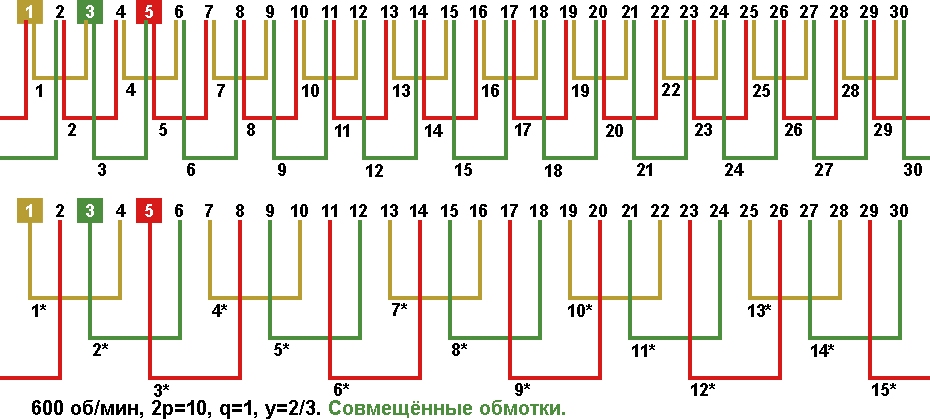 Схема укладки совмещённой обмотки в электродвигатели с количеством пазов 30, 2p=10 600 об/мин.