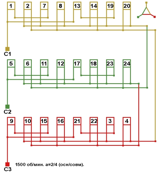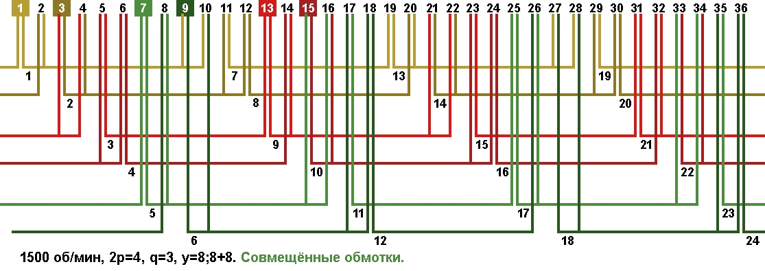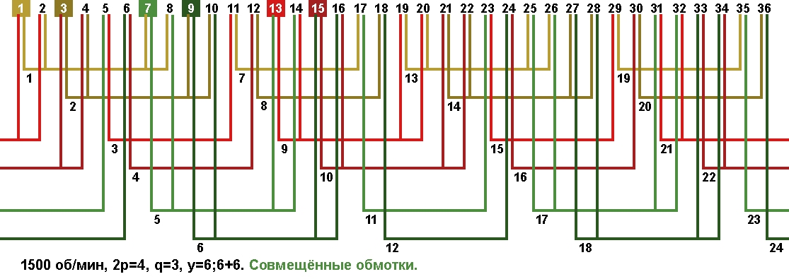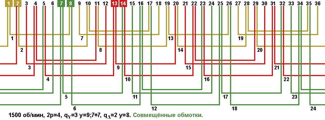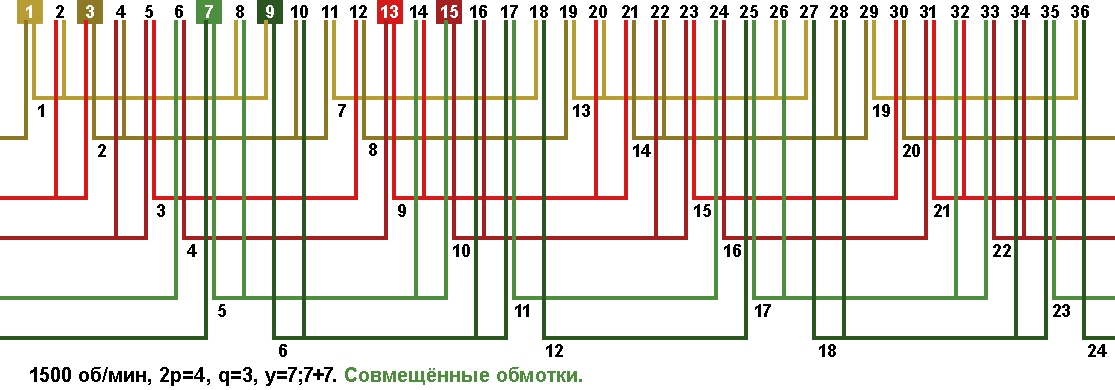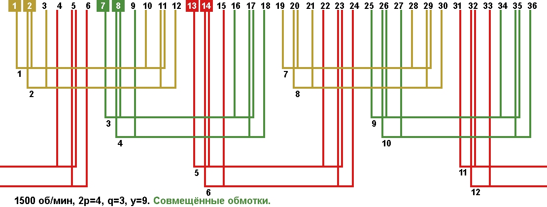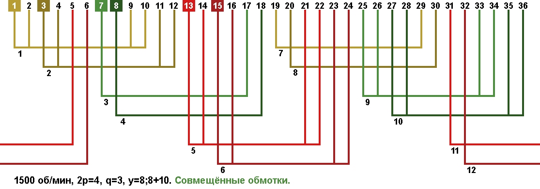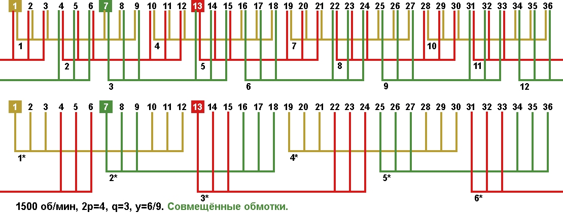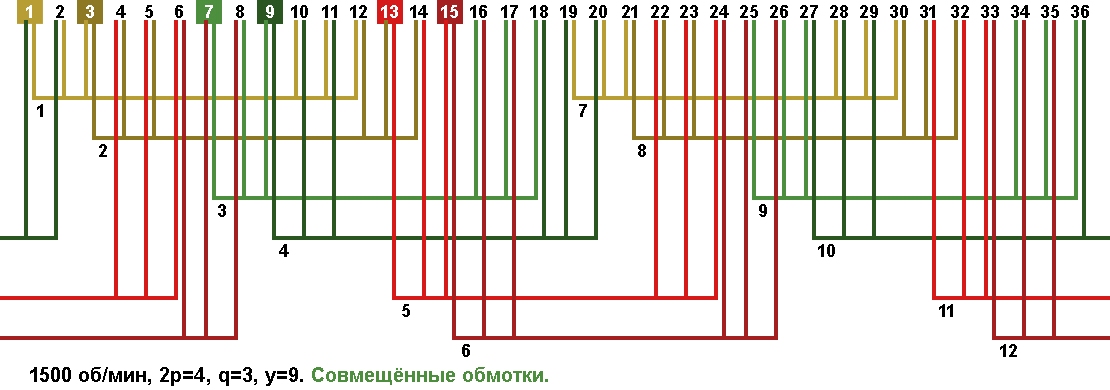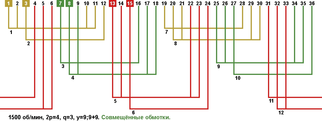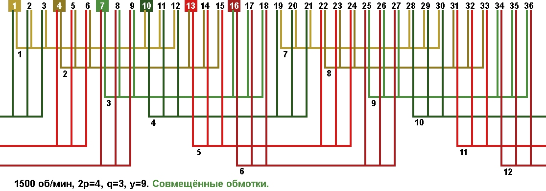 Схема укладки совмещённой обмотки в электродвигатели с количеством пазов 36, 2p=4 1500 об/мин.