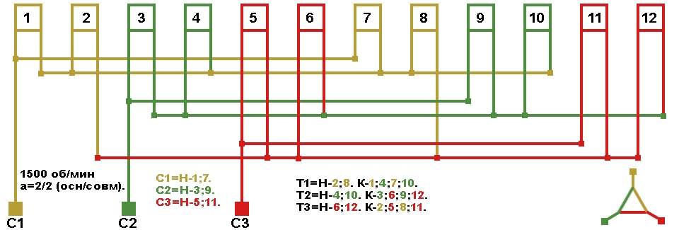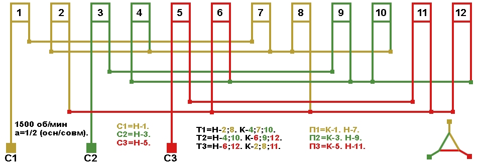 Схема укладки двухслойной совмещённой обмотки, шаг у=6;6+6.
