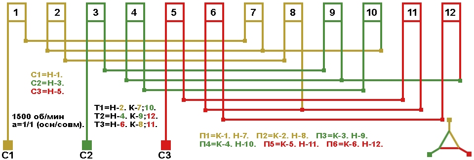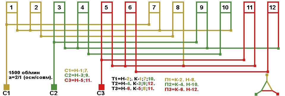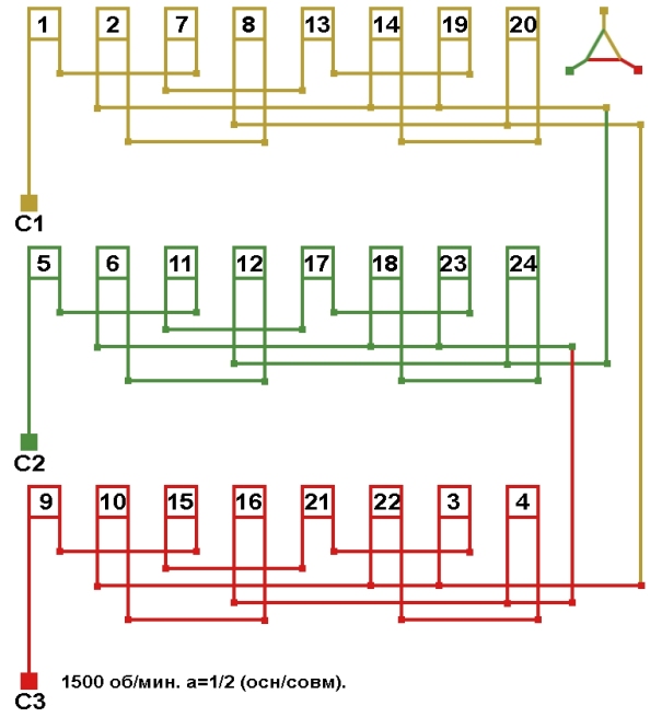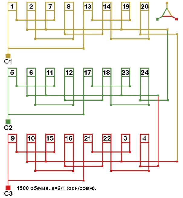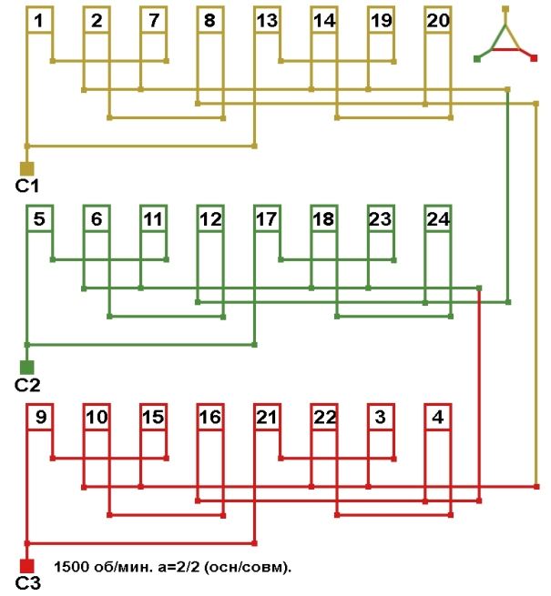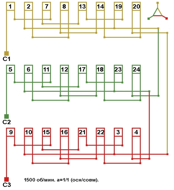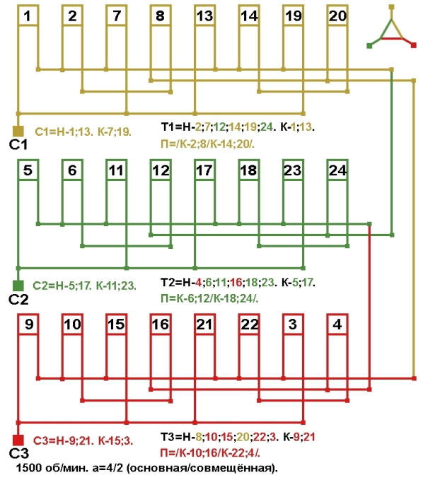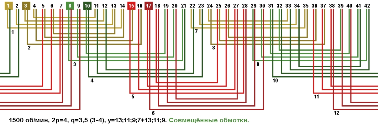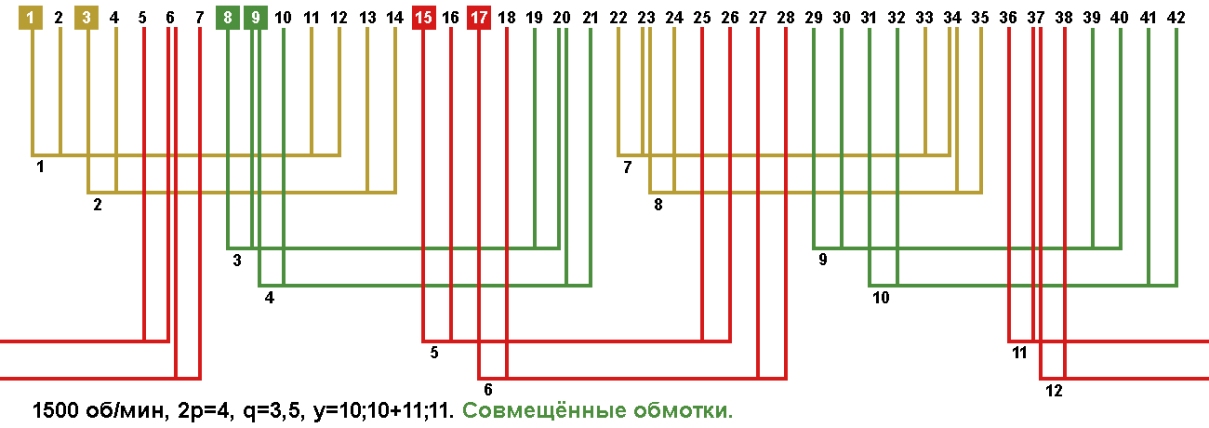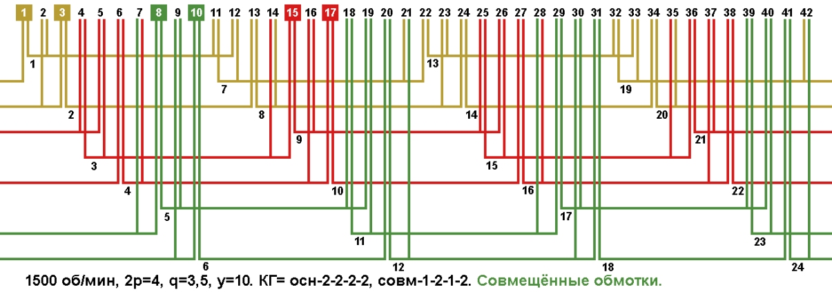 Схема укладки совмещённой обмотки в электродвигатели с количеством пазов 42, 2p=4 1500 об/мин.
