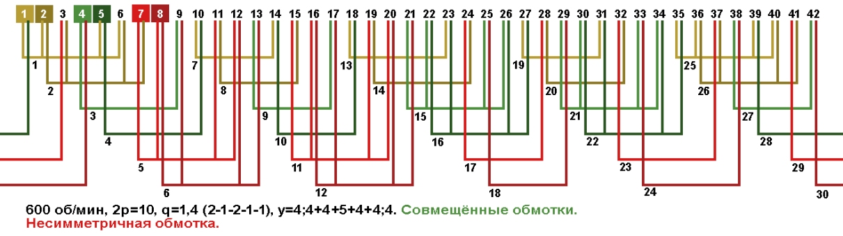 Схема укладки совмещённой обмотки в электродвигатели с количеством пазов 42, 2p=10 600 об/мин.