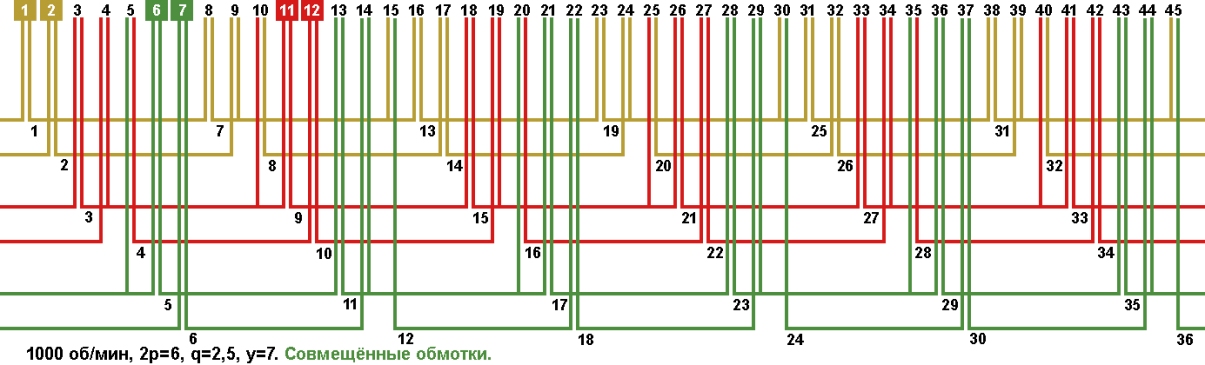 Схема укладки совмещённой обмотки в электродвигатели с количеством пазов 45, 2p=6 1000 об/мин.