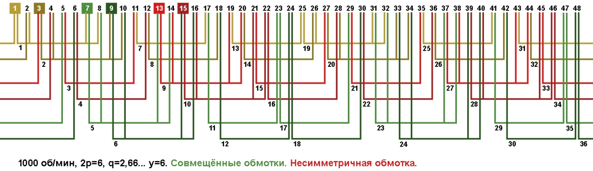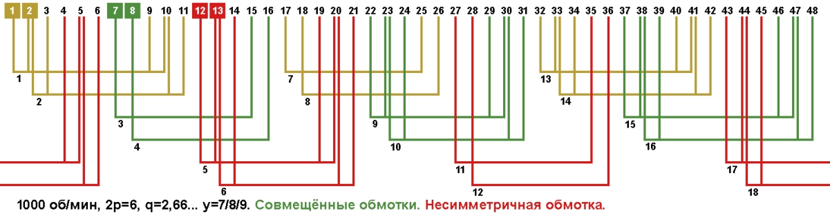 Схема укладки совмещённой обмотки в электродвигатели с количеством пазов 48, 2p=6 1000 об/мин.
