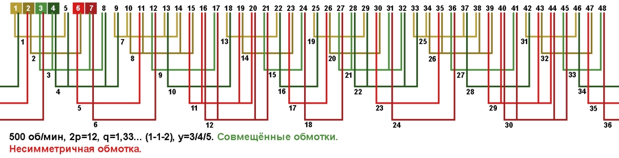 Схема укладки совмещённой обмотки в электродвигатели с количеством пазов 48, 2p=12 500 об/мин.
