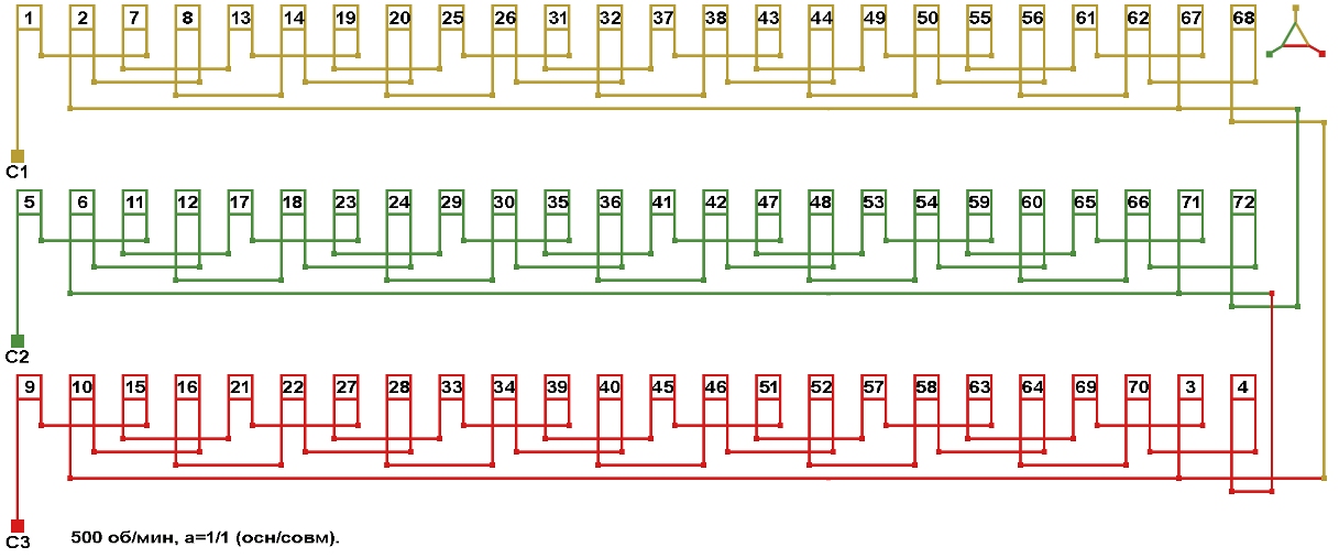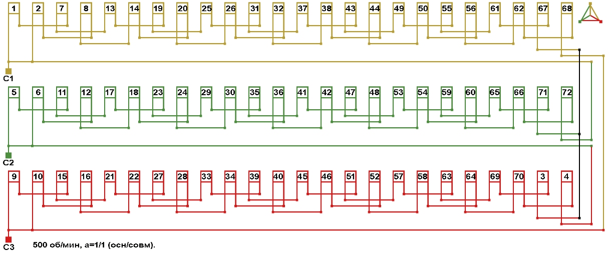 Схемы соединений электродвигателя с совмещённой обмоткой 500 об/мин, количество параллельных ветвей (основная/совмещённая): а=1/1.