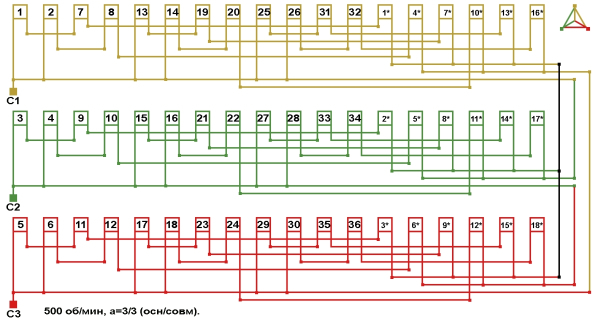 Схемы соединений электродвигателя с совмещённой обмоткой 500 об/мин, количество параллельных ветвей (основная/совмещённая): а=3/3.