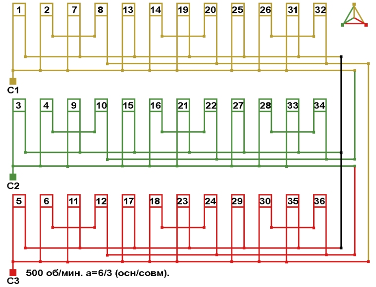 Схема соединений совмещённой обмотки с последовательным соединением фаз, количество параллельных ветвей (основная/совмещённая): а=6/3.
