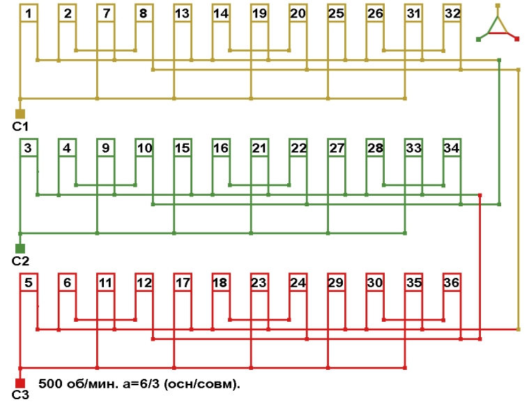 Схемы соединений электродвигателя с совмещённой обмоткой 500 об/мин, количество параллельных ветвей (основная/совмещённая): а=6/3.