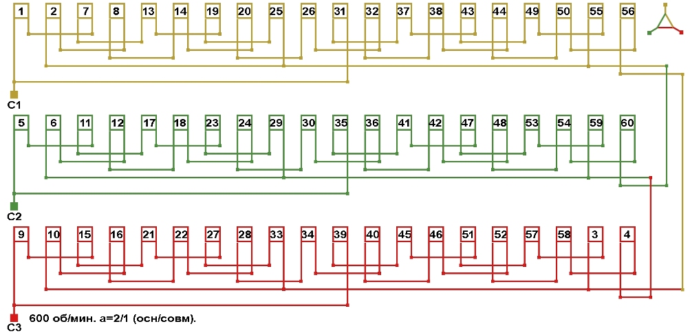 Схема соединений совмещённой обмотки с параллельным соединением фаз, количество параллельных ветвей (основная/совмещённая): а=2/1.