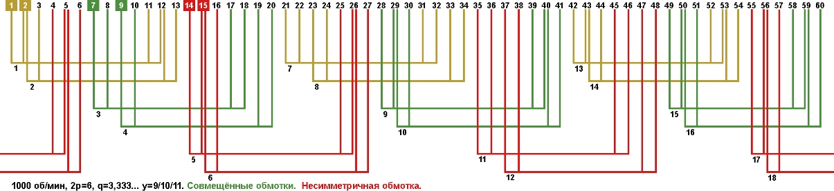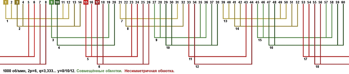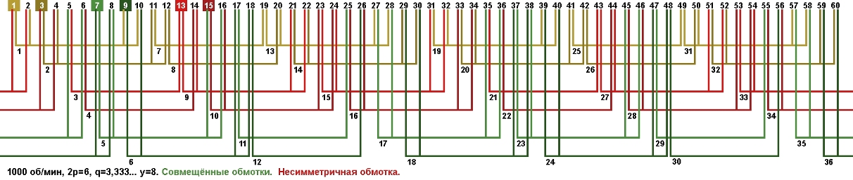 Схема укладки совмещённой обмотки в электродвигатели с количеством пазов 60, 2p=6 1000 об/мин.