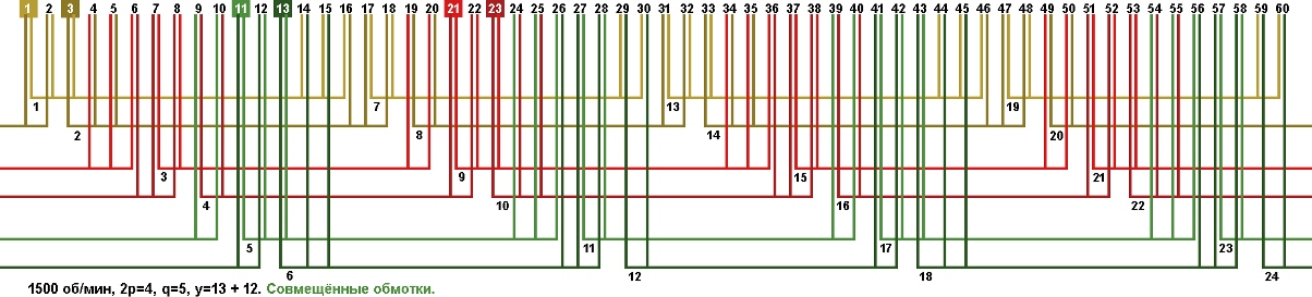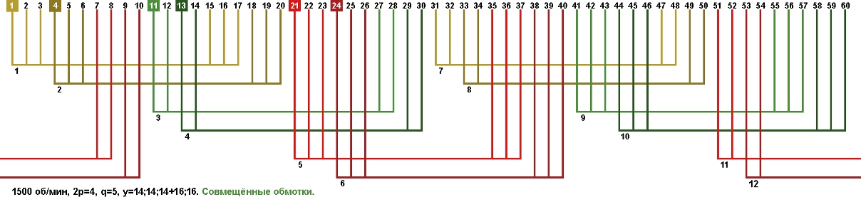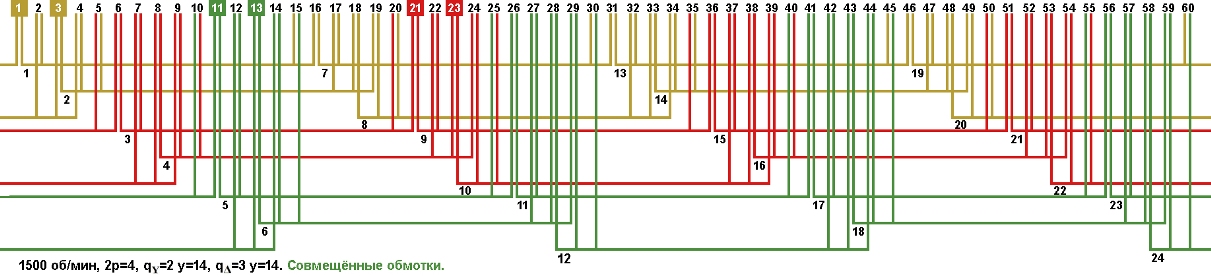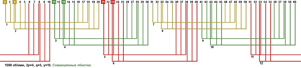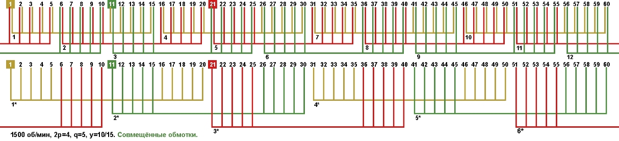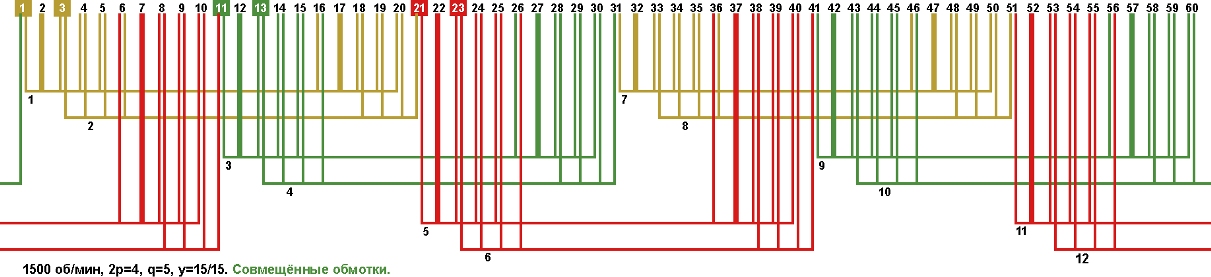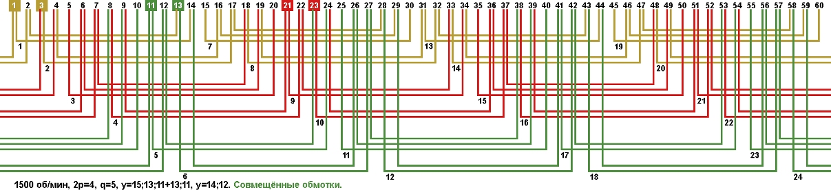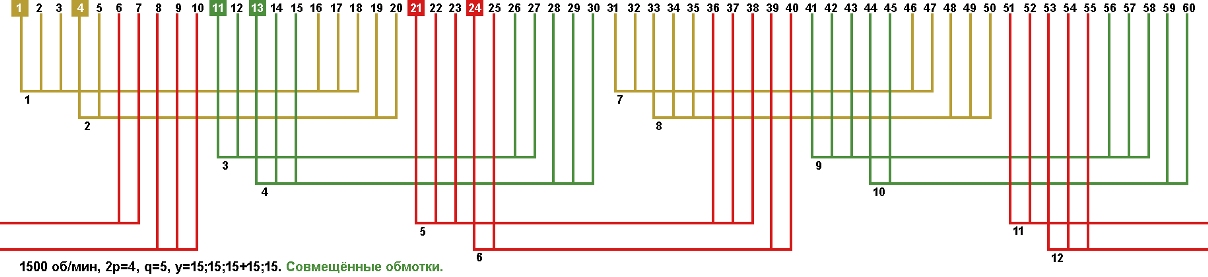 Схема укладки совмещённой обмотки в электродвигатели с количеством пазов 60, 2p=4 1500 об/мин.