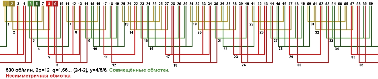 Схема укладки совмещённой обмотки в электродвигатели с количеством пазов 60, 2p=12 500 об/мин.