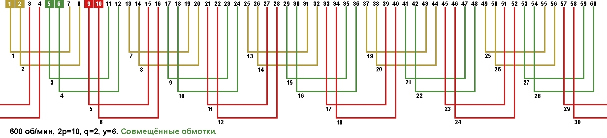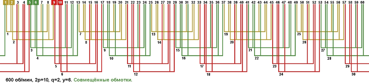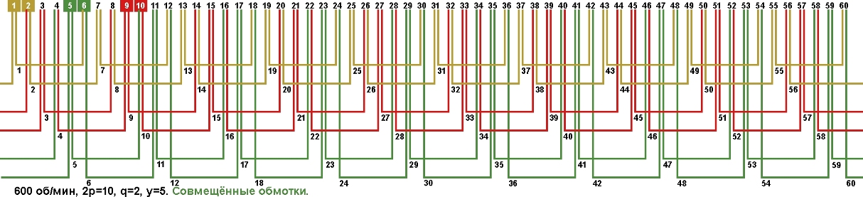 Схема укладки совмещённой обмотки в электродвигатели с количеством пазов 60, 2p=10 600 об/мин.