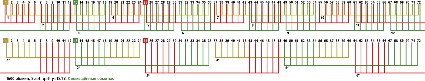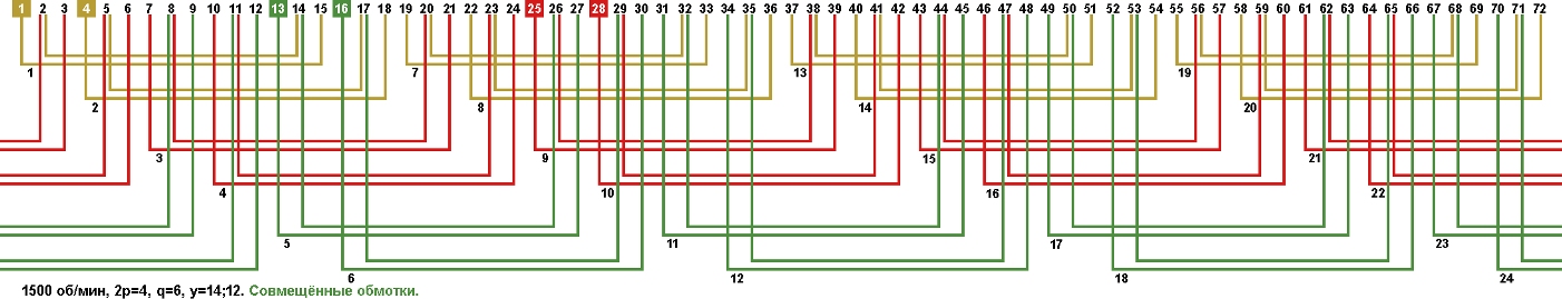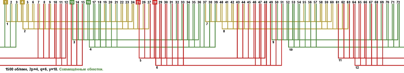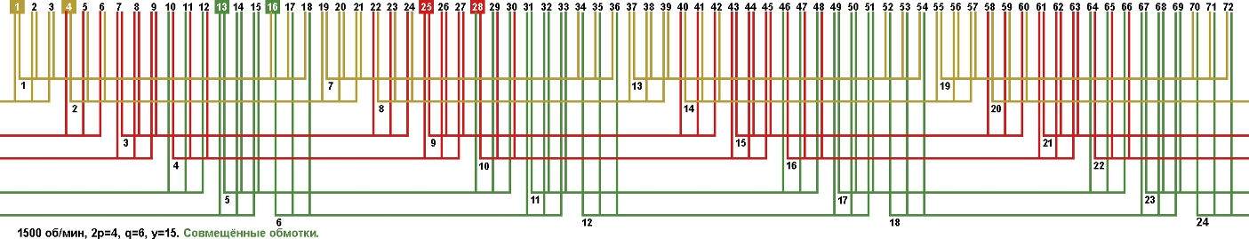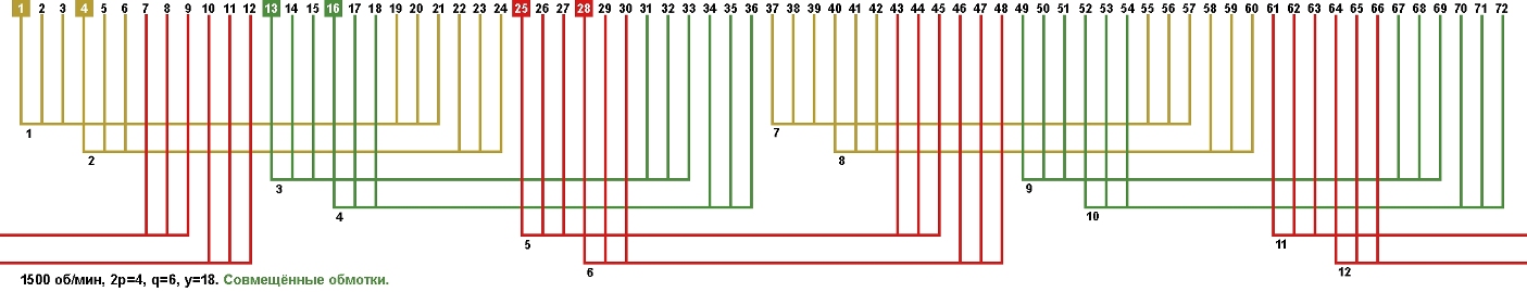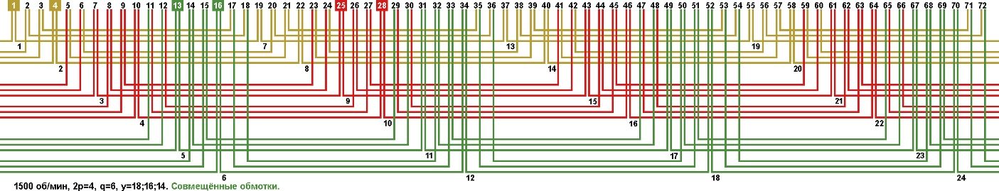 Схема укладки совмещённой обмотки в электродвигатели с количеством пазов 72, 2p=4 1500 обмин.