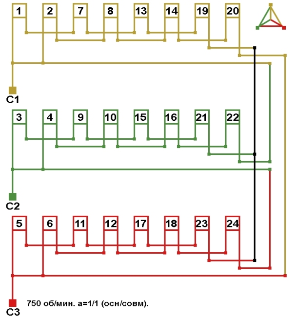 Схема соединений совмещённой обмотки с последовательным соединением фаз, количество параллельных ветвей а=1.