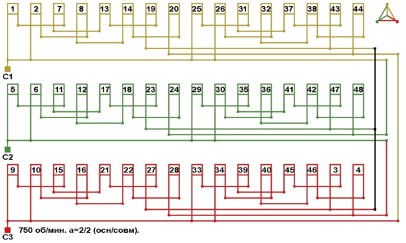 Схемы соединений электродвигателя с совмещённой обмоткой 750 об/мин, количество параллельных ветвей (основная/совмещённая): а=2/2.