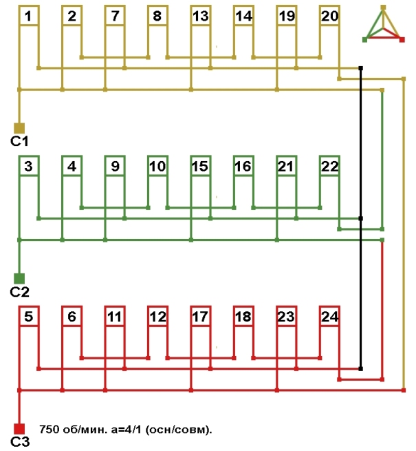 Схема соединений совмещённой обмотки с параллельным соединением фаз, количество параллельных ветвей (основная/совмещённая): а=4/1.