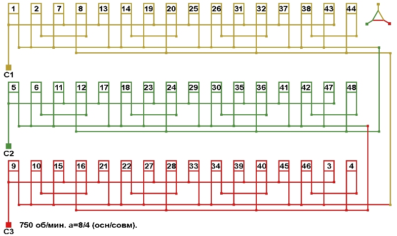 Схемы соединений электродвигателя с совмещённой обмоткой 750 об/мин, количество параллельных ветвей (основная/совмещённая): а=8/4.