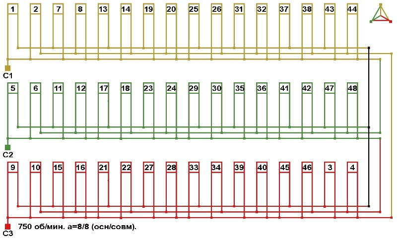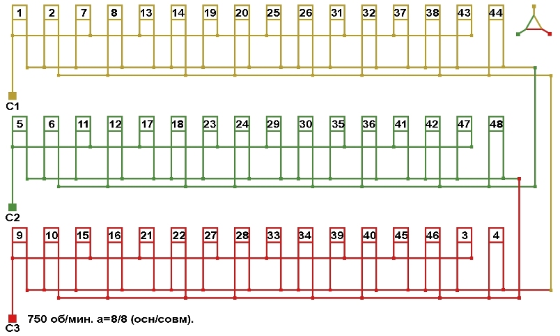 Схема соединений совмещённой обмотки с параллельным соединением фаз, количество параллельных ветвей (основная/совмещённая): а=8/8.
