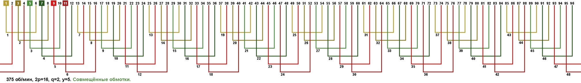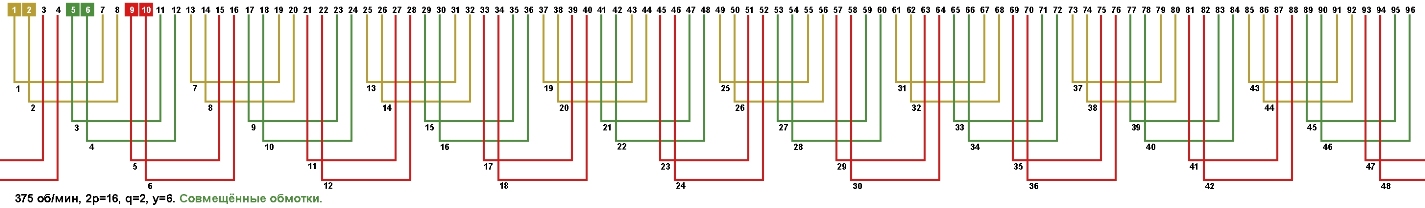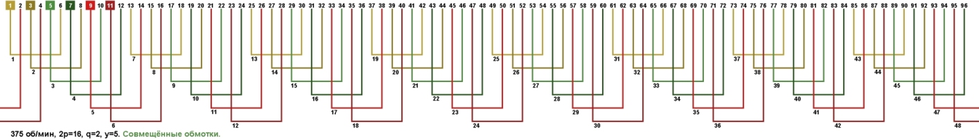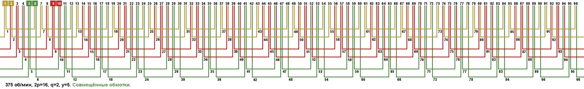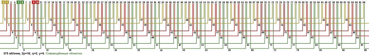 Схема укладки совмещённой обмотки в электродвигатели с количеством пазов 96, 2p=16 375 об/мин.