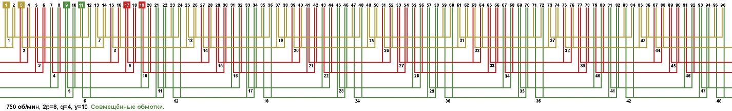 Схема укладки совмещённой обмотки в электродвигатели с количеством пазов 96, 2p=8 750 об/мин.