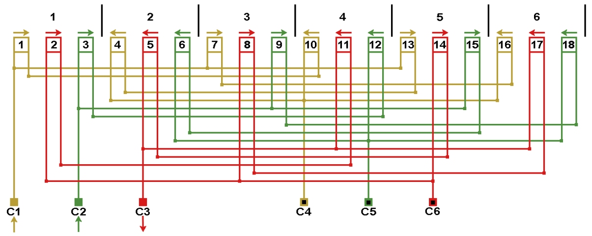 Схема соединений обмоток электродвигателей 1000 об/мин. 2p=6, количество параллельных ветвей а=3, вариант №2.