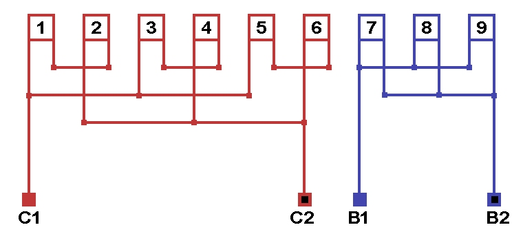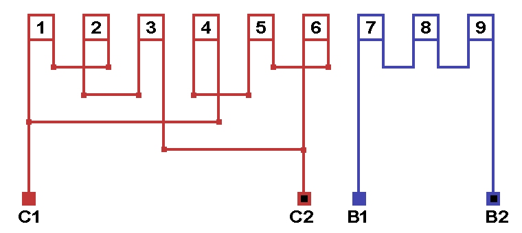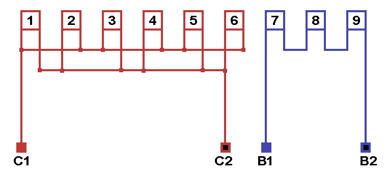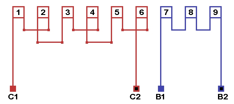 Схема соединений однофазной обмотки, количество параллельных ветвей в рабочей обмотке а=2, в пусковой обмотке а=1.