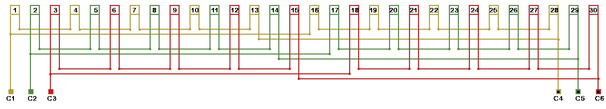 Схема соединений однослойной обмотки электродвигателя 300 об/мин. 2p=20, количество параллельных ветвей: а=2.