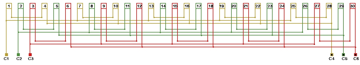 Схема соединений однослойной обмотки электродвигателя 300 об/мин. 2p=20, количество параллельных ветвей: а=5.