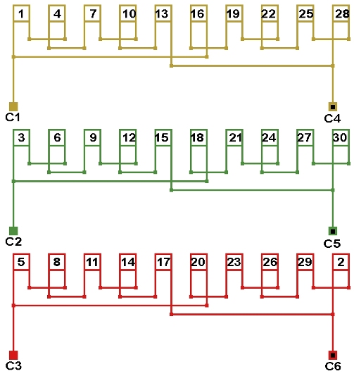 Схема соединений двухслойной обмотки электродвигателя 600 об/мин. 2p=10, количество параллельных ветвей: а=2.