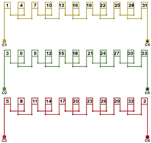 Схема соединений двухслойной обмотки электродвигателя с количеством пазов 33, 500 об/мин. 2p=12, количество параллельных ветвей: а=1.