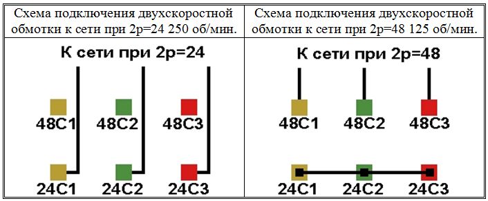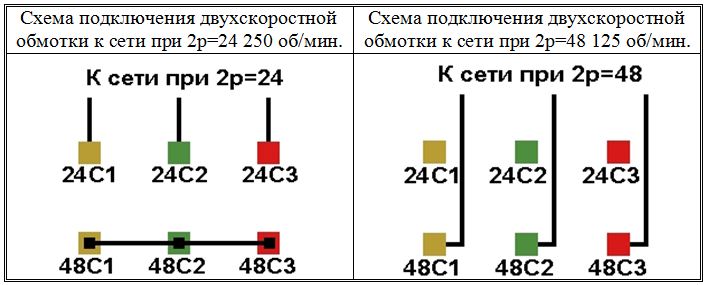 Схемы соединений и подключения двухскоростных обмоток. 125/250 об/мин. 2p=48/24.