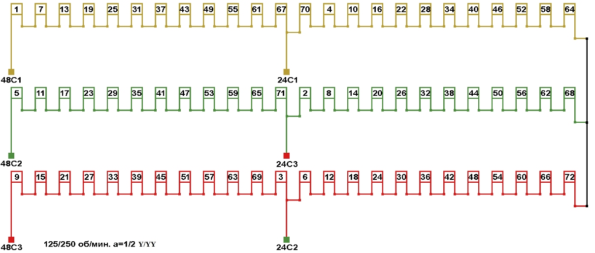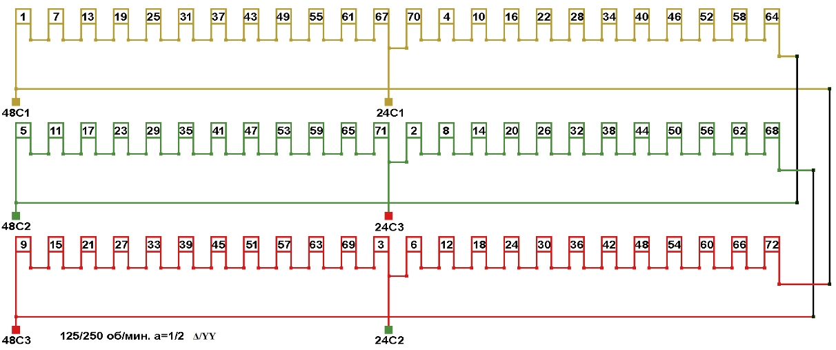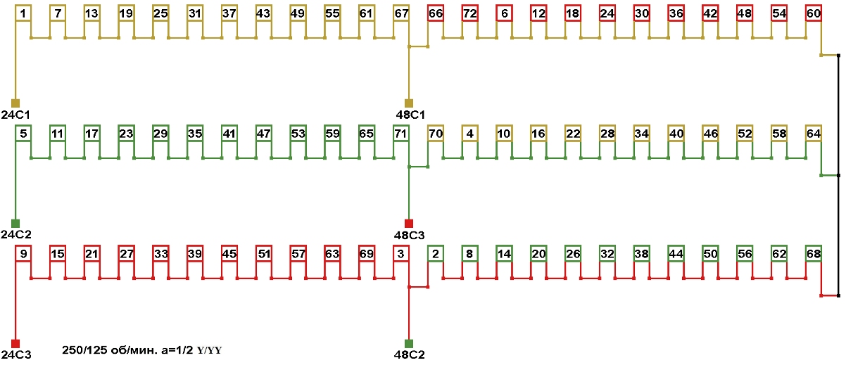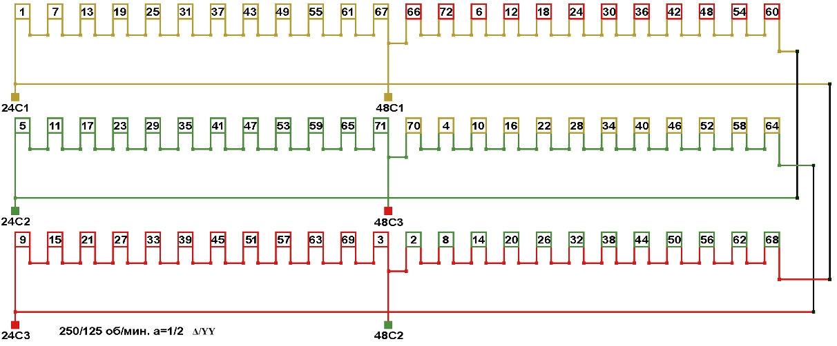 Схемы соединений обмоток двухскоростных электродвигателей 125/250 об/мин. 2p=48/24, а=1/2, соединение фаз Δ/YY.