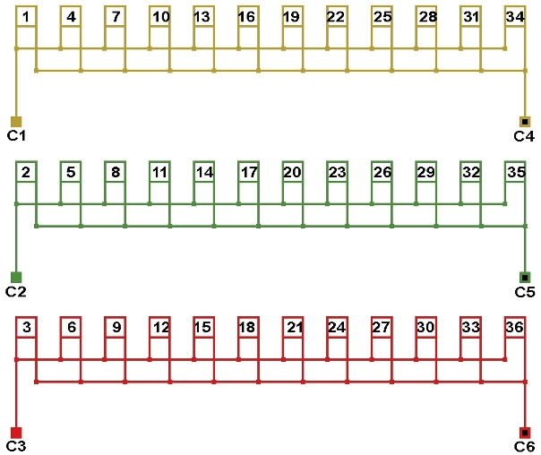 Схема соединений однослойной обмотки электродвигателя 250 об/мин. 2p=24, количество параллельных ветвей: а=12.