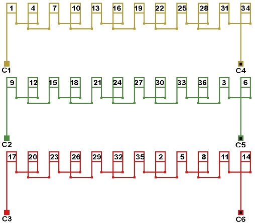 Схема соединений двухслойной обмотки электродвигателя 500 об. мин. 2p=12, начало фаз по пазам 1;11;21, количество параллельных ветвей: а=1.