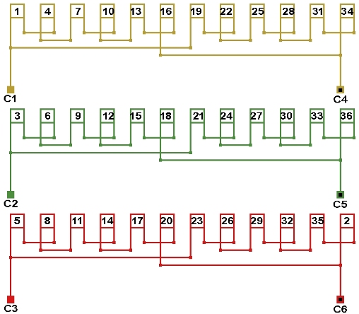 Схема соединений двухслойной обмотки электродвигателя 500 об/мин. 2p=12, количество параллельных ветвей: а=2.