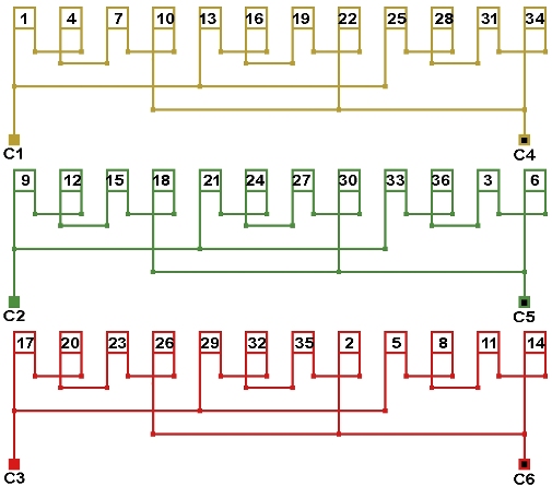 Схема соединений двухслойной обмотки электродвигателя 500 об. мин. 2p=12, начало фаз по пазам 1;11;21, количество параллельных ветвей: а=3.