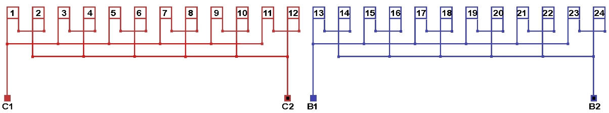 Схемы соединений и подключения обмоток однофазных электродвигателей 500 об/мин. 2p=12, количество параллельных ветвей: а=6.