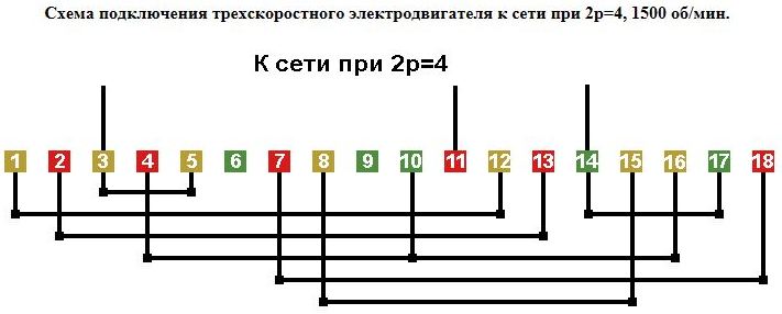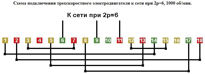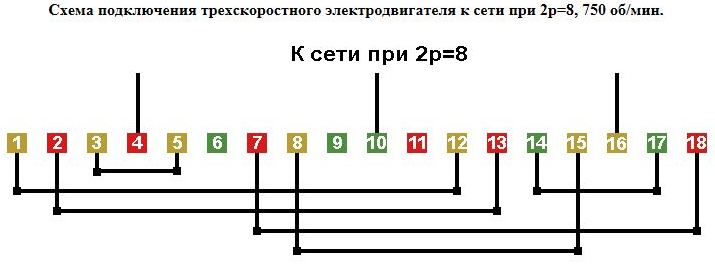 Схемы соединений и подключения трехскоростных обмоток. 2p=8/6/4, 750/1000/1500 об/мин.