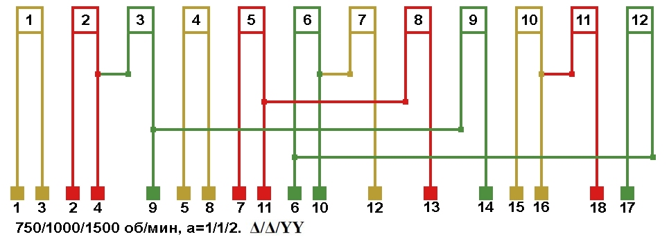 Схема соединений трехскоростной обмотки. 2p=8/6/4, 750/1000/1500 об/мин., соединение фаз Δ/Δ/YY.