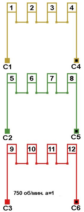 Схема соединений обмотки электродвигателя 750 об/мин. 2p=8, количество параллельных ветвей: а=1.