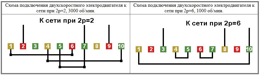 Схемы соединений и подключения двухскоростных обмоток. 2p=6/2, 1000/3000 об/мин.