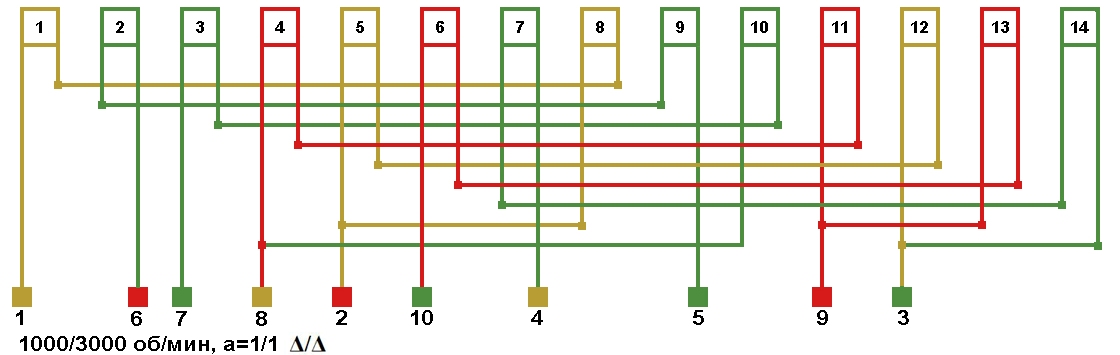 Схема соединений двухскоростной обмотки. 2p=6/2, 1000/3000 об/мин., соединение фаз Δ/Δ.
