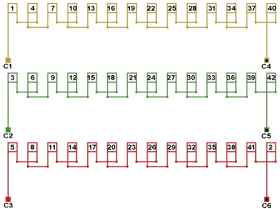 Схема соединений двухслойной обмотки электродвигателя 428 об/мин. 2p=14, количество параллельных ветвей: а=1.