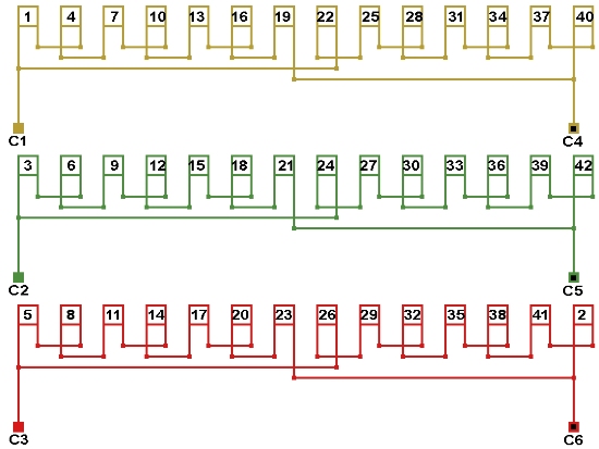 Схема соединений двухслойной обмотки электродвигателя 428 об/мин. 2p=14, количество параллельных ветвей: а=2.