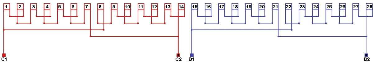 Схемы соединений и подключения обмоток однофазных электродвигателей 428 об/мин. 2p=14, количество параллельных ветвей: а=2.