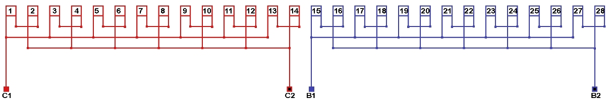 Схемы соединений и подключения обмоток однофазных электродвигателей 428 об/мин. 2p=14, количество параллельных ветвей: а=7.