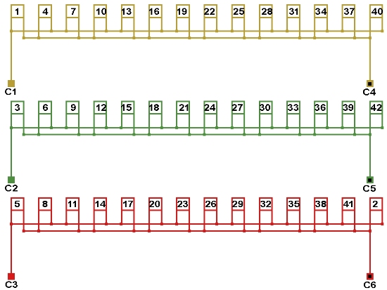 Схема соединений двухслойной обмотки электродвигателя 428 об/мин. 2p=14, количество параллельных ветвей: а=14.
