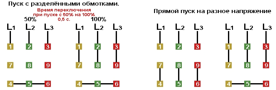 Схема подключения электродвигателей холодильного компрессора с разделёнными обмотками "PW" 1500 об/мин, Y/YY и Δ/ΔΔ.
