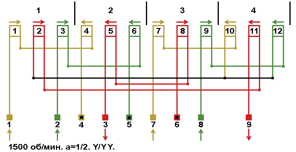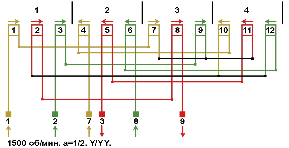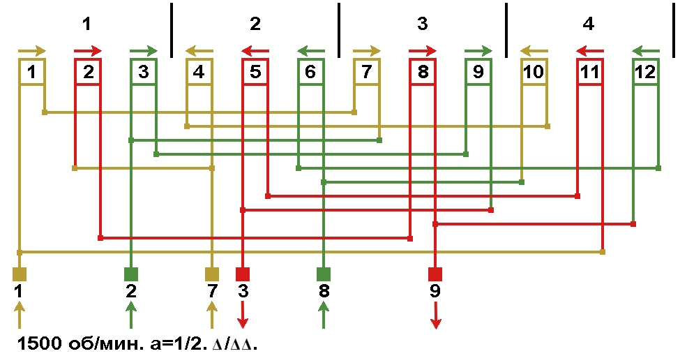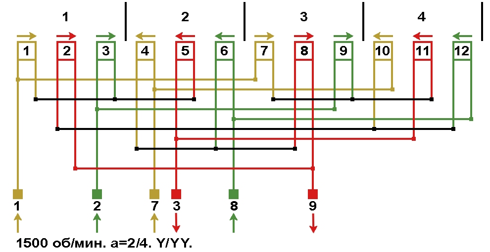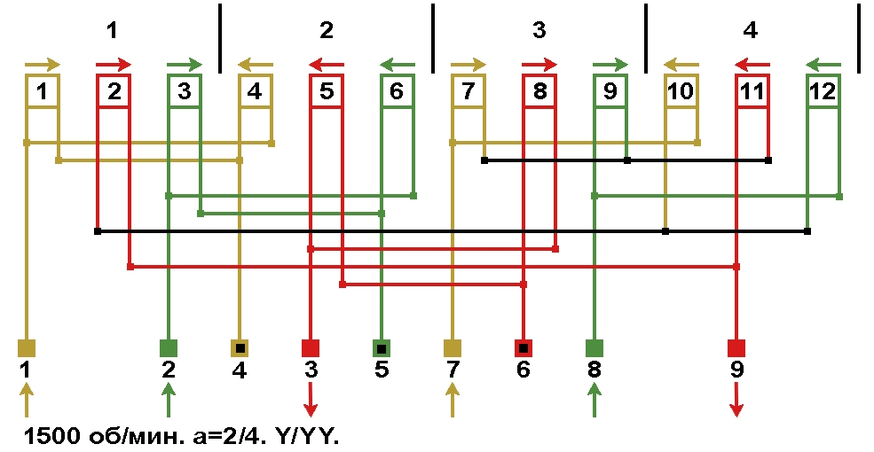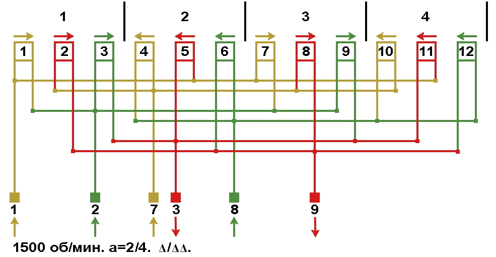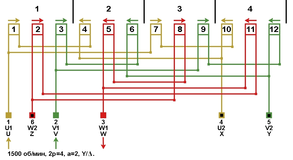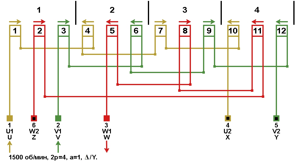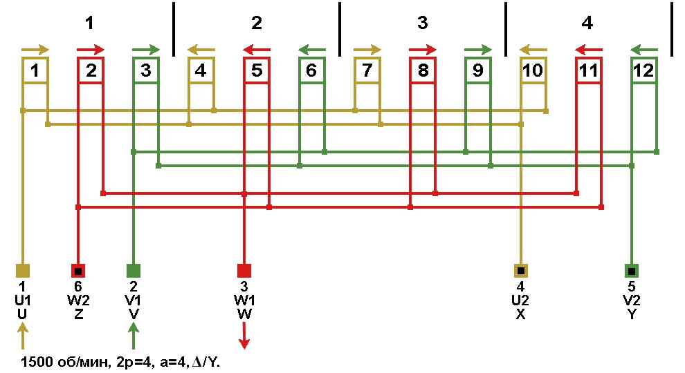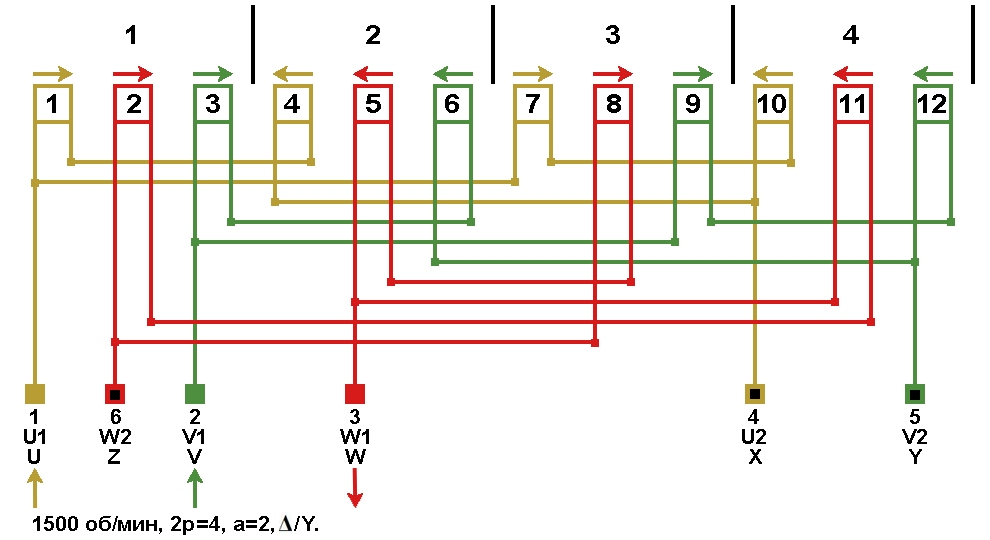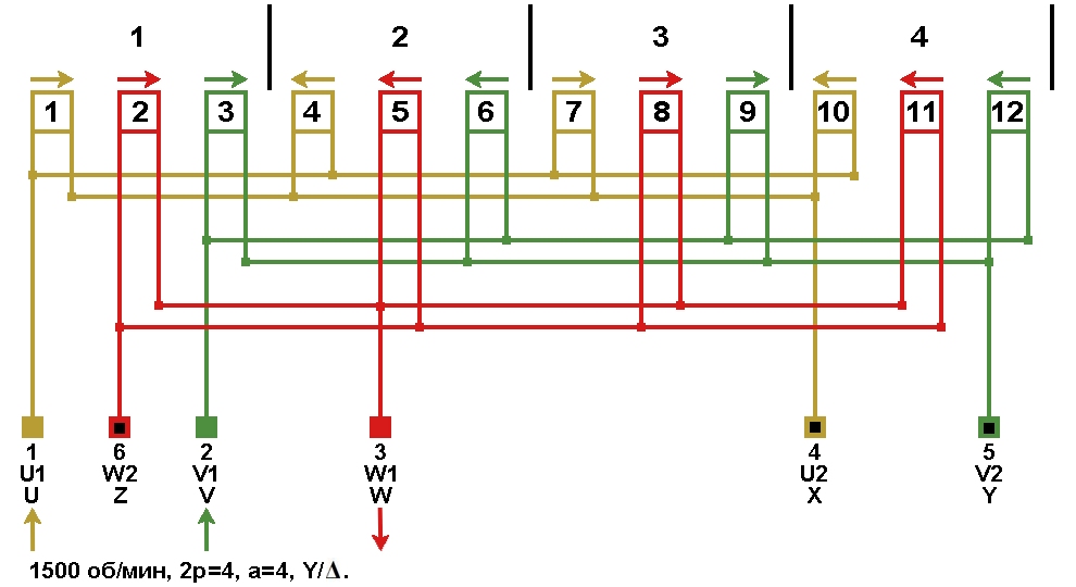 Схема соединений обмотки, количество параллельных ветвей а=4, Y/Δ.